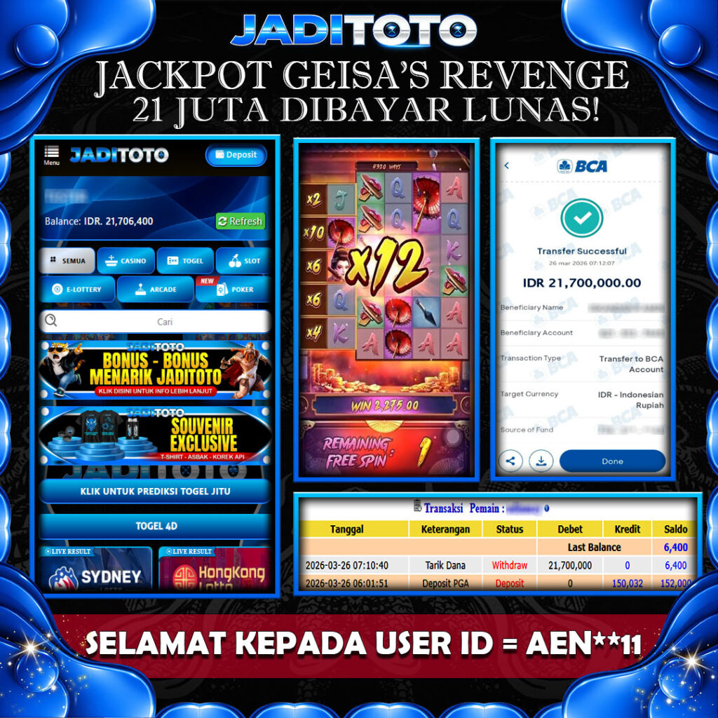 JADITOTO JACKPOT SLOT GEISA S REVENGE Rp21.700.000– LUNAS, RABU ,25 MARET 2026 Selamat kepada User id : ATO**21 Telah berhasil mendapatkan kemenangan besar pada permainan