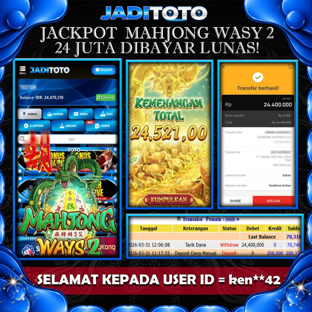 JADITOTO JACKPOT SLOT MAHJONG WASY 2 Rp24.400.000– LUNAS, SELASA,31 MARET 2026 Selamat kepada User id : KEN**42 Telah berhasil mendapatkan kemenangan besar pada permainan