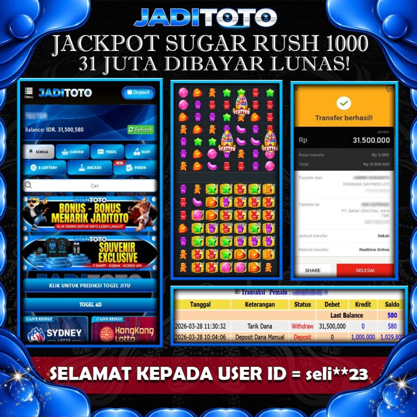 JADITOTO JACKPOT SLOT SUGAR RUSH 1000 Rp31.500.000– LUNAS, SABTU,28 MARET 2026 Selamat kepada User id : SELI**23 Telah berhasil mendapatkan kemenangan besar pada permainan