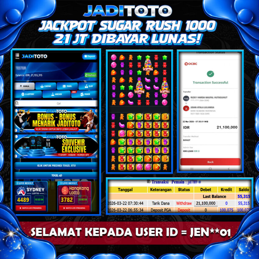 JADITOTO JACKPOT SLOT SUGAR RUSH 1000 Rp21.100.000– LUNAS, MINGGU ,22 MARET 2026 Selamat kepada User id : JEN**01 Telah berhasil mendapatkan kemenangan besar pada permainan